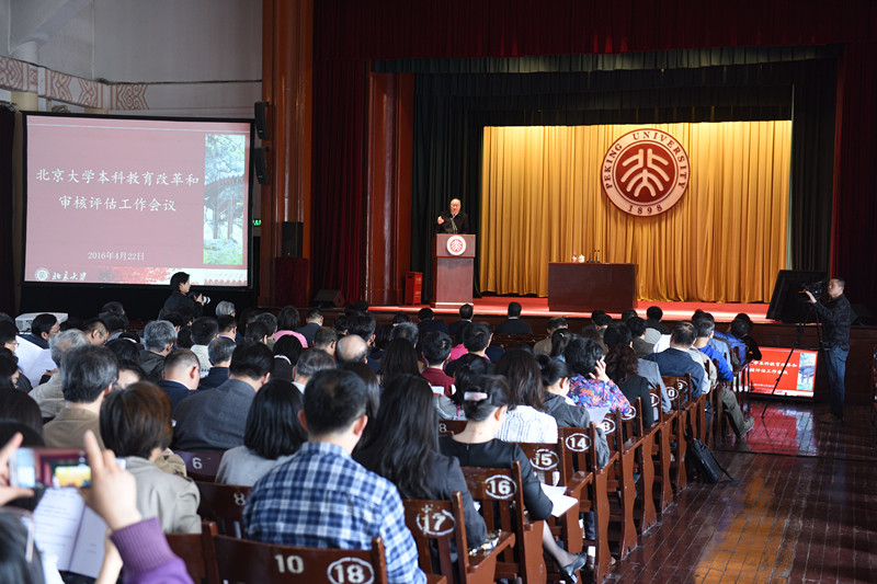 2016年4月22日上午,北京大学在办公楼礼堂召开了“北京大学本科教育改革与审核评估工作会议”。北京大学朱善璐书记和林建华校长分别做了主旨讲话,教育部评估中心吴岩主任出席会议并就北大高质量做好审核评估工作作了专题报告。北京大学各院系院长(系主任)、书记、主管本科教学工作的副院长(副主任)及本科教务员、学校各职能部门负责人、本科发展战略研究小组和老教授调研组成员等共计150余人参会。